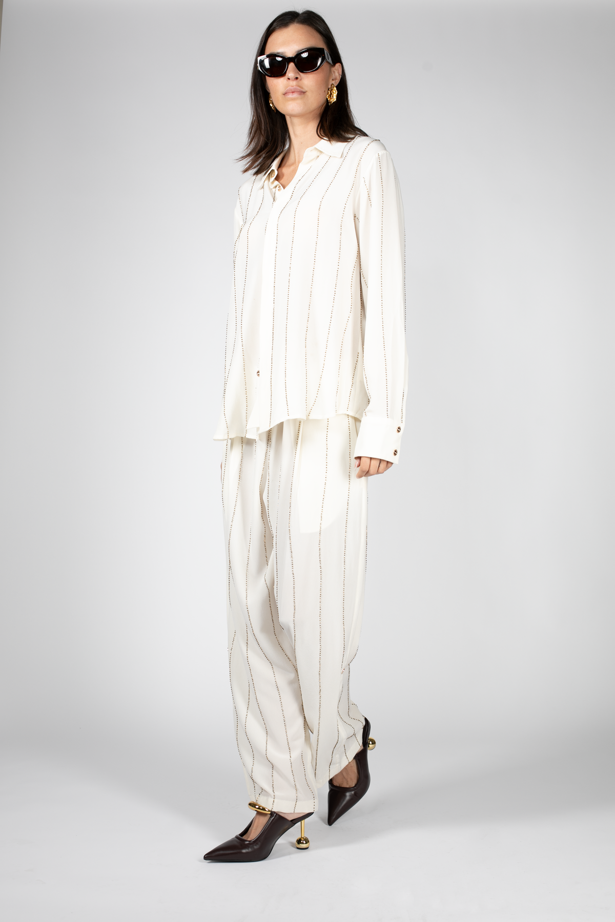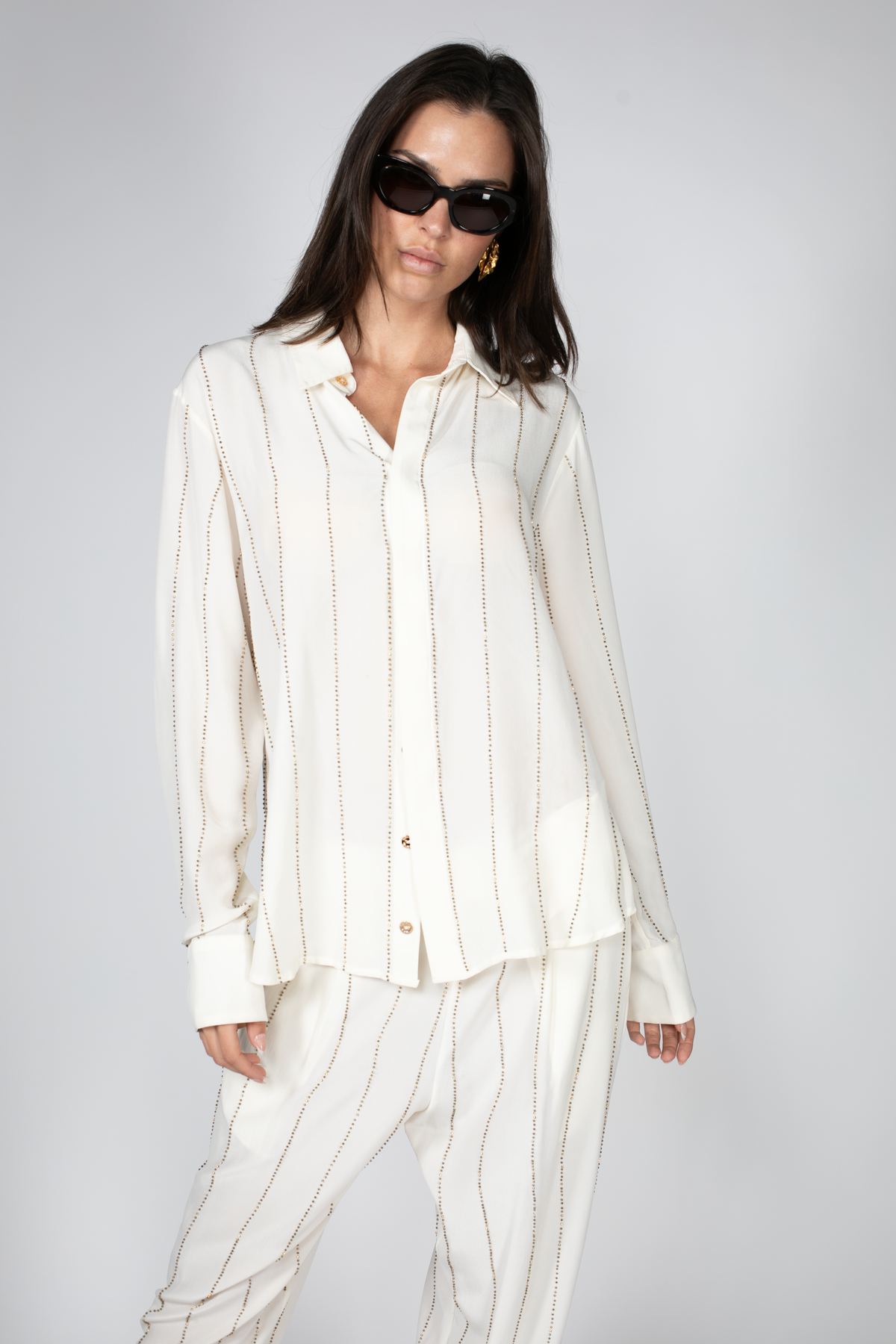 Get ready to indulge in luxury with our exclusive Seraphina Top. Made of high-quality silk and adorned with hematite stones and shimmering softly under the caress of light, this limited edition silk top evokes an aura of sophistication and delicate allure.